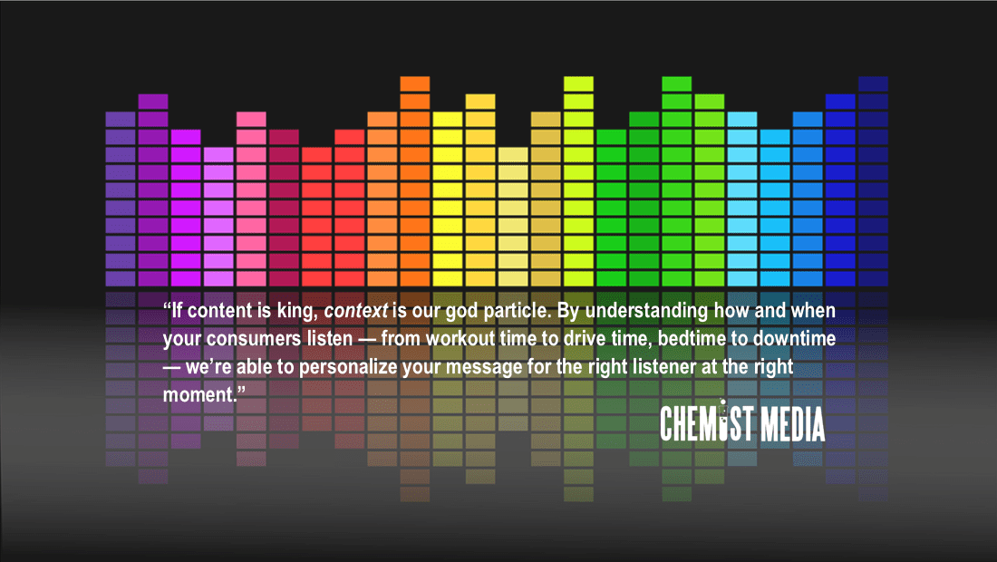 Chemist AUDIO is a full-stack audio solution for media planning, buying, production and advertising execution. With Podcasting, Streaming, Smart Speakers, Radio, YouTube and more it's no surprise that audio is the leading driver of media consumption reaching 96% of Adults 18+ in America every single week.